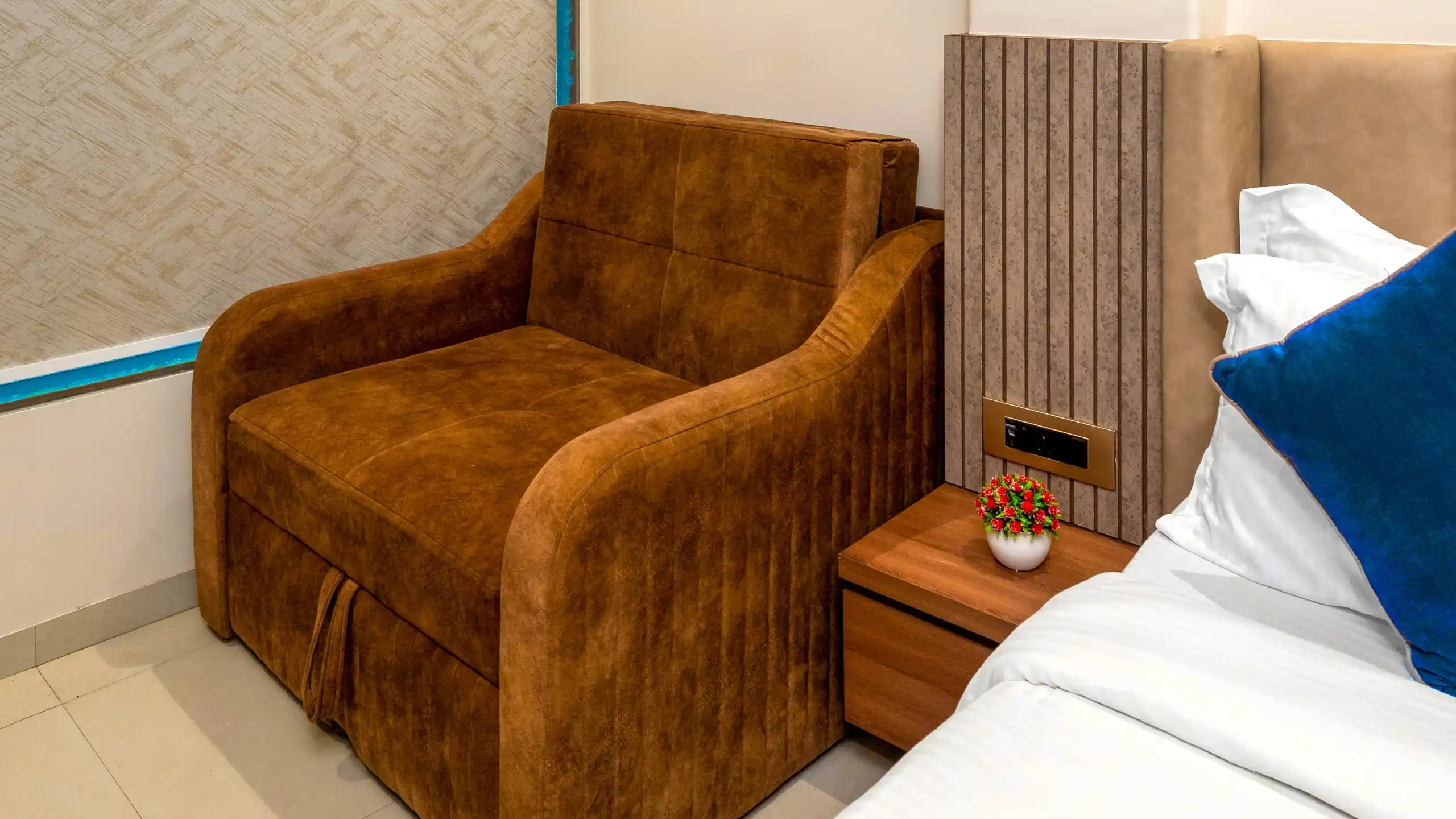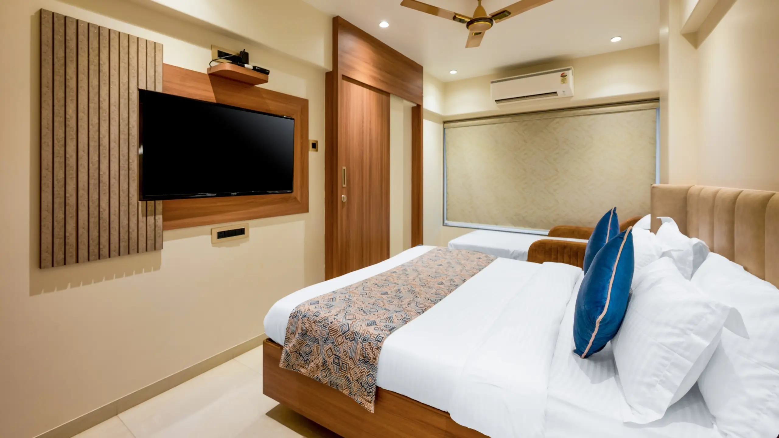 Our Deluxe Twin Double Bed Room is ideal for families or small groups who prefer extra space. With two single separate beds, stylish décor, a mini fridge, and enhanced amenities, it’s a perfect mix of functionality and elegance.